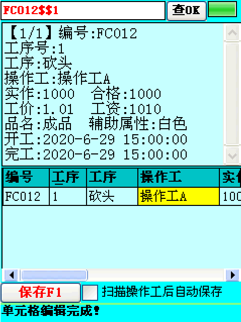 4)     如果需要对实作数量,合格数量,开工时间,完工时间进行修改,可以移动光标到相应需要修改的单元格,按【OK键】进行修改,修改后,按【OK键】进行确认。