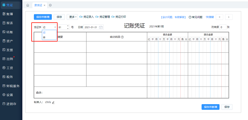 精斗云录入凭证如何设置从凭证字开始录入