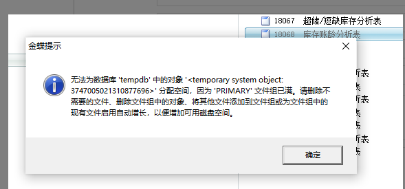 打开金蝶供应链单据或者财务功能报错无法为数据库“tempdb”中的对象***分配空间已满
