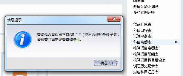 标准/迷你版打开科目余额表,提示:查询包含有保留字符(如" '")或不合理的条件子句?