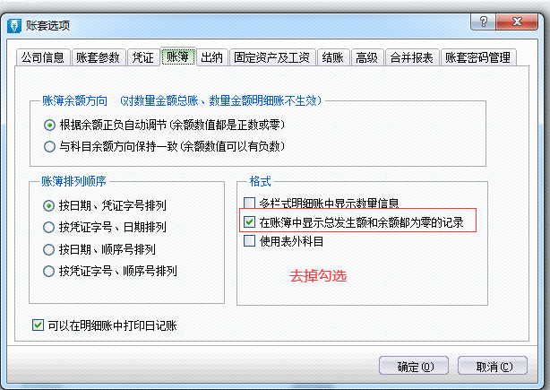 在【系统维护】-【账套选项]】-【账簿】页签中,取消勾选参数“在账簿中显示总发生额和余额都为零的记录”即可。