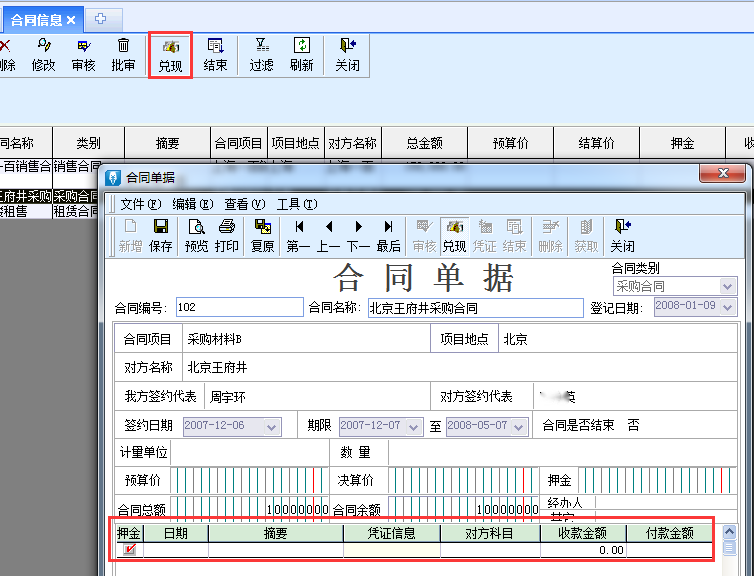 1、支付/收到押金时, 在合同单据的窗口点击“兑现”, 勾选下方“押金”,在付款或者收款金额处录入正数金额;