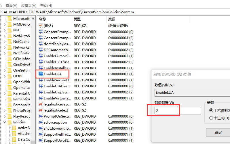 2、打开注册表,计算机\HKEY_LOCAL_MACHINE\SOFTWARE\Microsoft\Windows\CurrentVersion\Policies\System\EnableLUA。将该值修改为0。