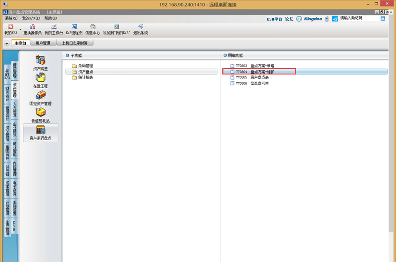 1、使用有权限的用户登录k/3主控台,依次点击[资产管理]-[资产条码盘点]-[资产盘点],双节打开[盘点方案-维护];