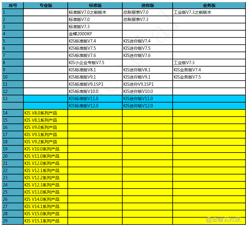 蓝色背景表格中的版本可以直接使用当前版本“金蝶KIS云·专业版升级工具”来进行升级处理;