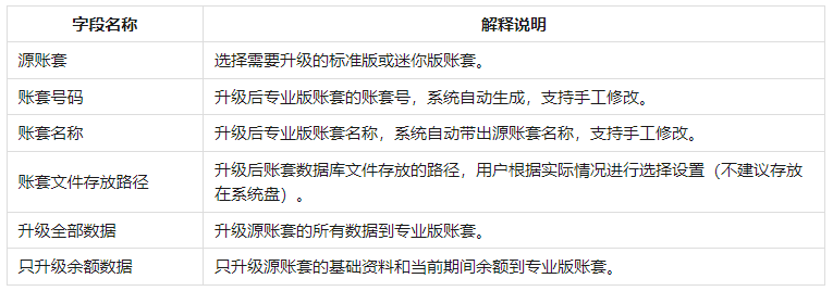 【金蝶KIS云标准版(迷你版)升级专业版工具】--【升级设置】页签字段说明: