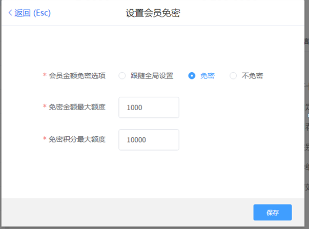 方式一:零售后台中,打开【门店管理】—【参数设置】—【会员营销参数】—【会员支付设置】——选择“启用会员卡免密支付”,设置对应的免密额度,点击保存。