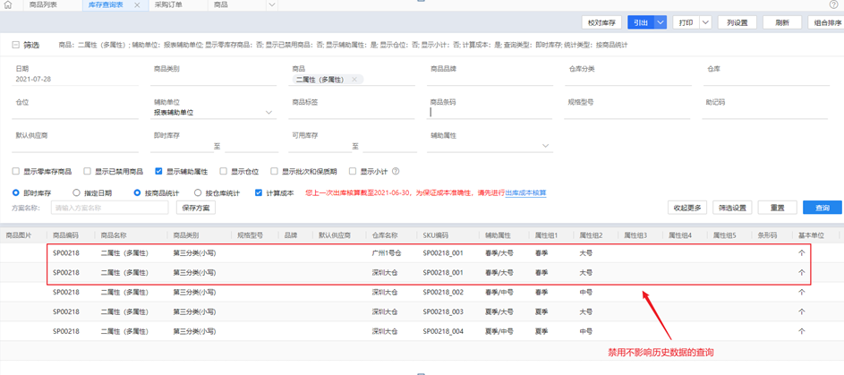 (5)禁用后SKU不影响报表查询,历史开单的商品可正常查询;