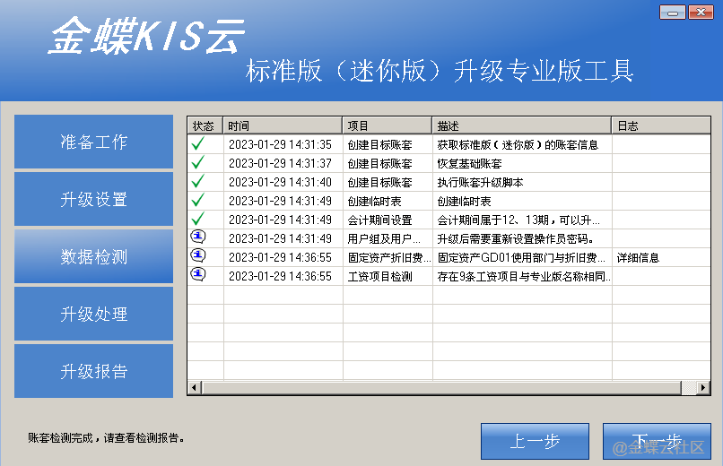 检测完成后,升级工具会给予对应的提示,如果涉及到需要调整的数据,工具会写为日志,双击可以进行查看。确认完成后,可点击【下一步】。