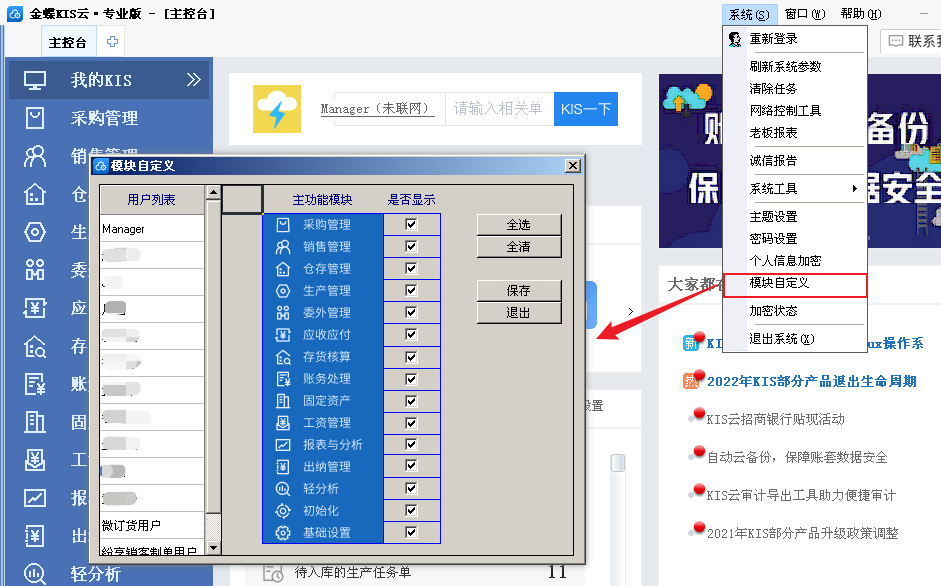 1. 在账套界面右上角菜单栏选择【系统】→【模块自定义】,系统调出【模块自定义】界面。
