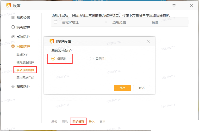 1、打开火绒杀毒软件,设置--网络防护--爆破攻击防护,设置成【仅记录】;