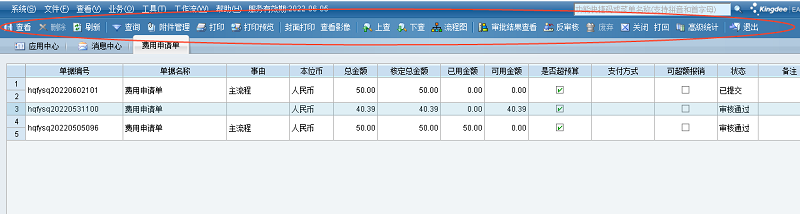 费用申请单的其它操作包括两大类,一类是在序时簿上,另一类是在单据上。