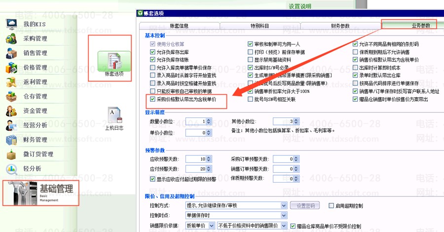 2、依次点击【基础管理】—【账套选项】,在【业务参数】页签中勾选参数“采购价格默认带出为含税单价”即可。