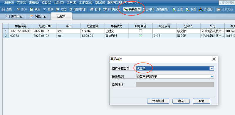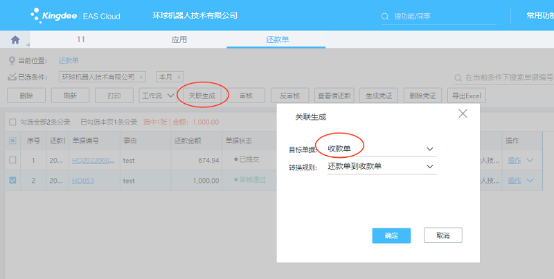 财务在EAS Cloud客户端还款单序时簿选中需要关联收款的还款单,点【关联生成】按钮,系统通过单据转换规则生成收款单。