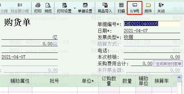 在购货单或销售单单据界面,单击上方的“S/N号”按钮,录入商品相应的S/N号后即可保存单据。