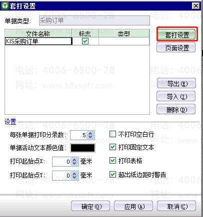 3、退出套打设计器界面,打开需套打的采购订单点击右上角[文件]-[套打设置],删除原来的模板,点击[导入]导入修改之后的模板进行套打。(低版本需退出软件重新导入,9.0版本不需要进行此操作)