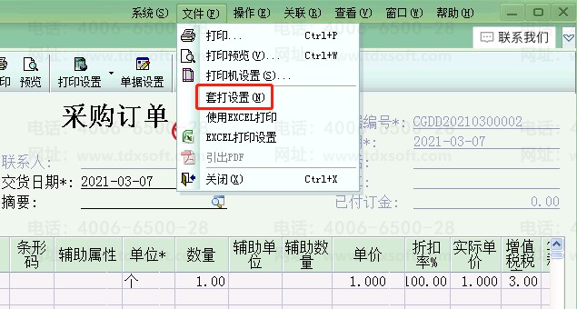 1、打开需套打的采购订单点击右上角[文件]-[套打设置],进入套打设置界面之后再点击[套打设置]重新登录该账套进入套打设计器;