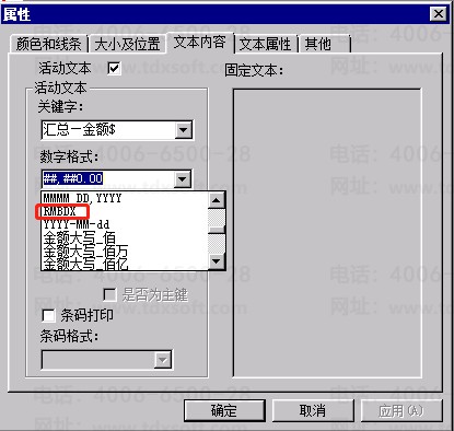 2、在套打设计器界面点击左上角打开图标打开对应模板,选中模板中汇总金额对应的文本框右击选择[对象属性]-[文本内容]将数字格式选择为RMBDX,保存对应模板;