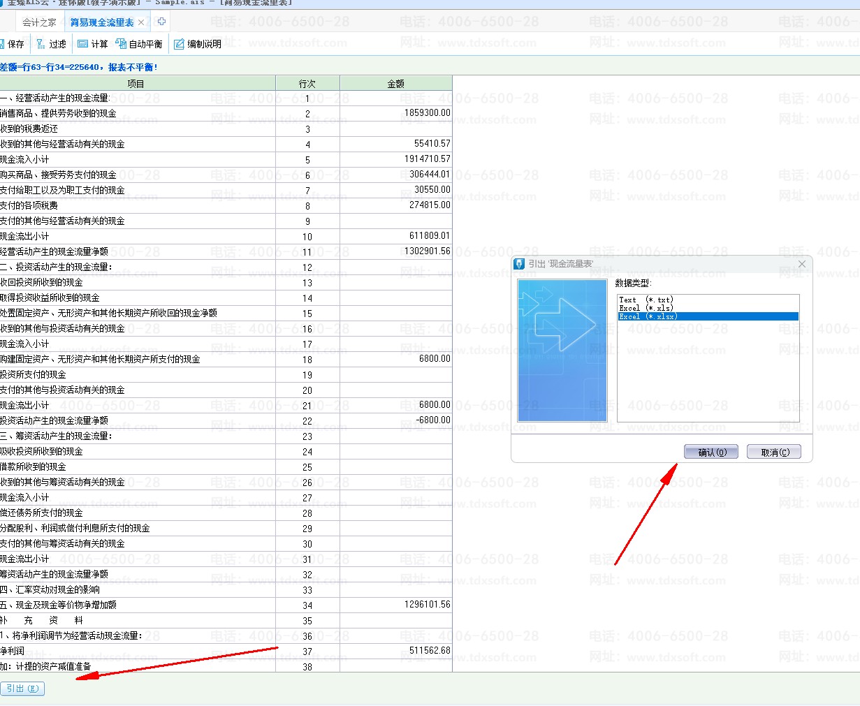 点击【报表】-【简易现金流量表】选择期间进入报表后,左下角点击【引出】按钮选择格式【确定】后选择需要引出的文件位置点击输入文件名称后点击保存即可。