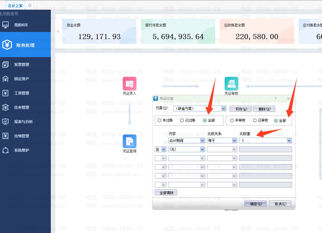 登录软件之后,点击【账务处理】-【凭证查询】-过账和审核栏均选【全部】,在【内容】处选择【会计期间】,【比较关系】选择【等于】,【比较值】选择【3】点击确定,则可以查看3月份的所有凭证。