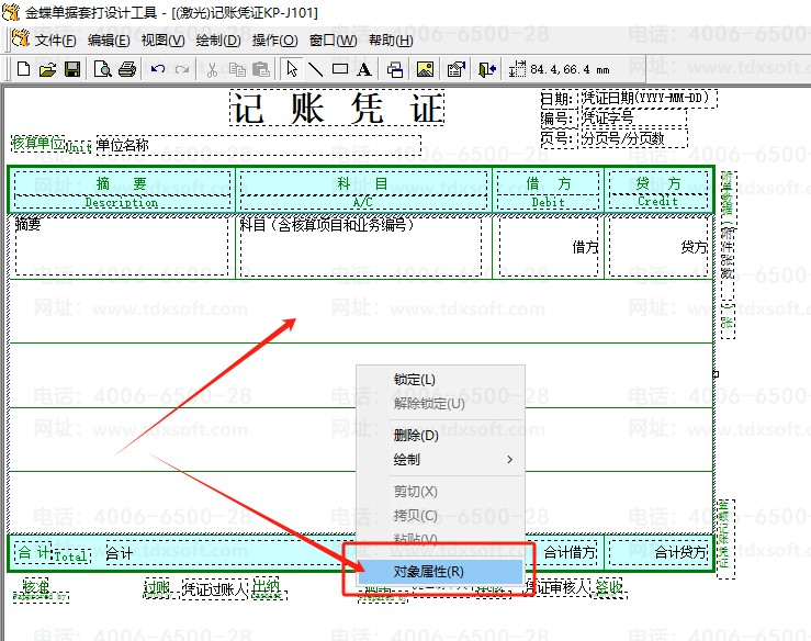 在凭证套打设置中-先单击选中分录行的表格部分-单击鼠标右键-选择【对象属性】在【颜色和线条】页签中-调整设置【填充的颜色】选项后点击确认即可,如下图所示: