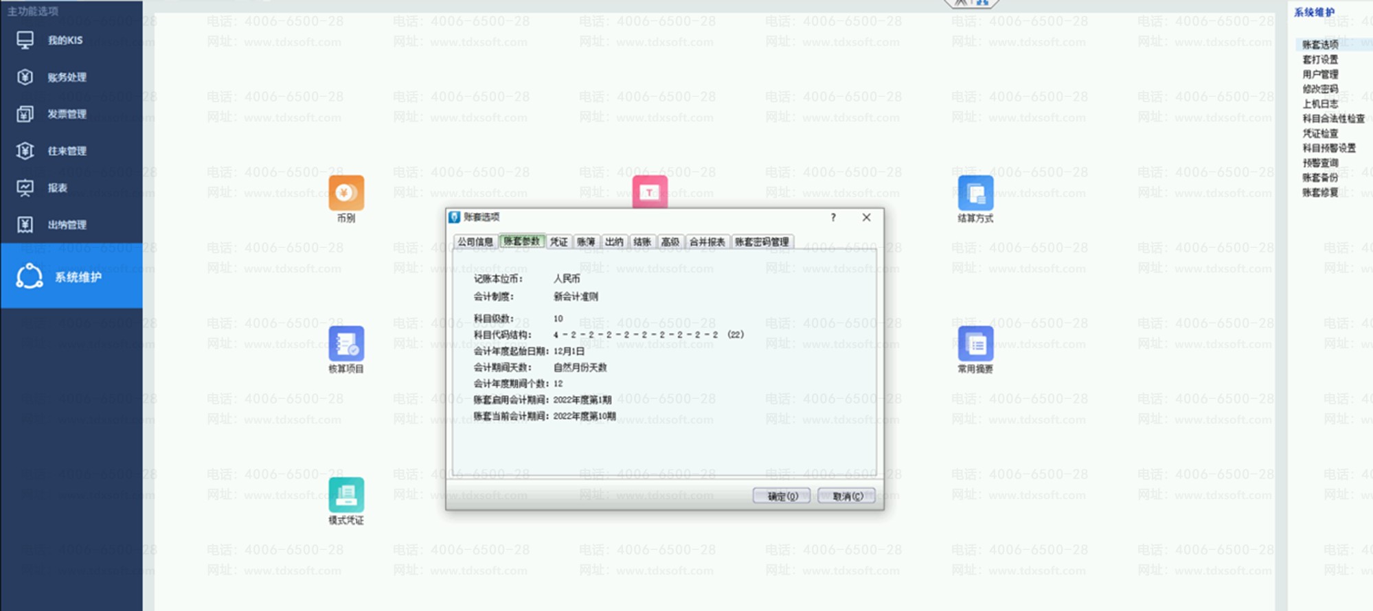 软件主界面依次点击[系统维护]-[账套选项]-[账套参数],检查“会计年度起始日期”与账套启用会计期间是否在同一期。如图,比如当前账套启用期间设置在2022年1月,但会计年度起始日期却是12月1日,所以在查询22年10月份的科目余额表时,虽然过滤条件的会计期间是第10期,但表头会显示2323年9月(第10期),相当于会计年度从22年12月一直往后顺延到23年了,所以显示不一致。