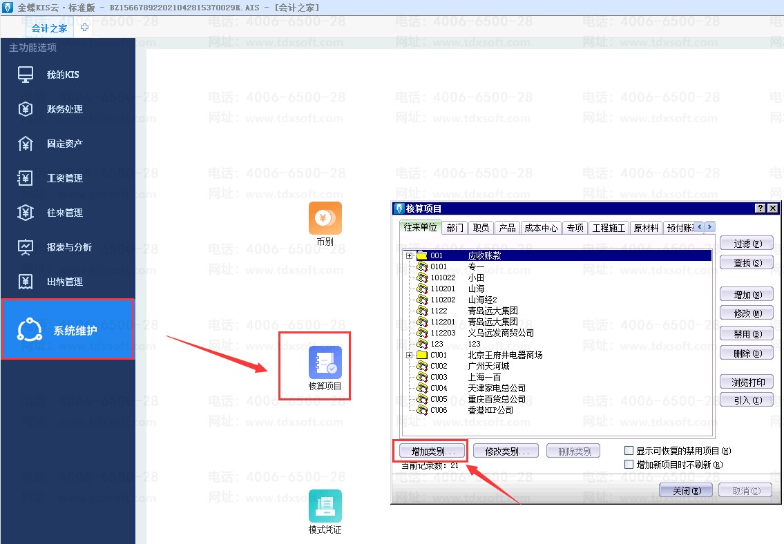 2、鼠标左键单击核算项目页签左下角的【增加类别】进入【核算项目类别】页签;