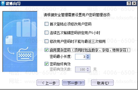 因为新建账套的时候默认会勾选启用复杂密码,密码最小长度为3