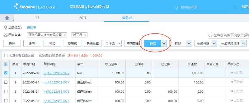在EAS Cloud网页端/客户端登录以后,选择菜单〖财务会计〗->〖费用管理〗->〖费用核算〗->〖借款单〗,点【还款】按钮生成还款单(费用系统)还款。