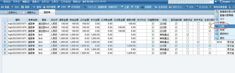 2.全部还款:借款单借款以后,有时在用于报销之前,也会遇到借款事项的取消, 此时可以直接选择全额还款。