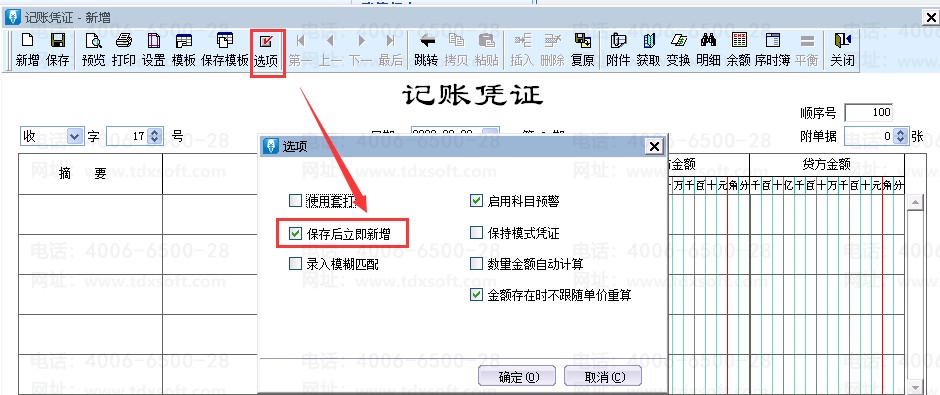 凭证新增界面,勾选[选项]按钮下的“保存后立即新增”即可。