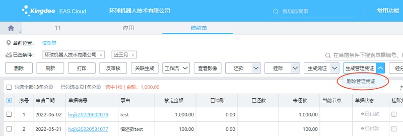 财务在EAS Cloud网页端借款单序时簿选中需要删除管理凭证的借款单,点【删除管理凭证】按钮,系统会直接删除管理凭证。