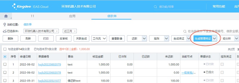 财务在EAS Cloud 网页端借款单序时簿选中需要生成管理凭证的借款单,点【生成管理凭证】按钮,系统通过动态会计规则生成管理凭证。