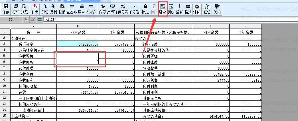 1、例:资产负债表,单击选中B1和C1两个单元格;