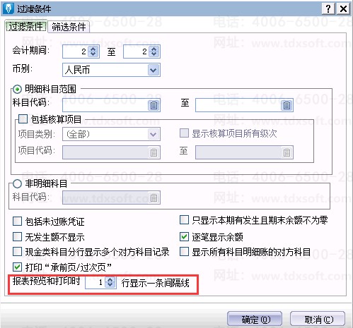 单击[账务处理]-[明细账],在过滤条件窗口下方将[报表预览和打印X行显示一条间隔线]数值调为1即可。
