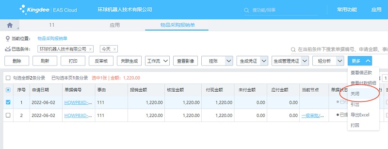 • 财务在EAS Cloud网页端/客户端物品采购报销单序时簿选中需要关闭的物品采购报销单,点【关闭】按钮,物品采购报销单是否关闭成功会有相应的提示。
