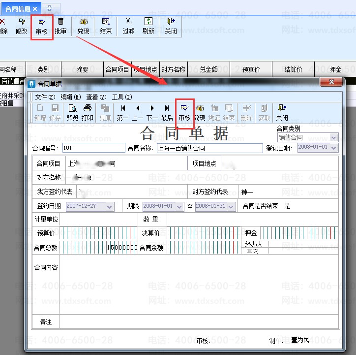 2、单击选中需要反审核的合同,单击工具栏中[审核]按钮,打开[合同]窗口;