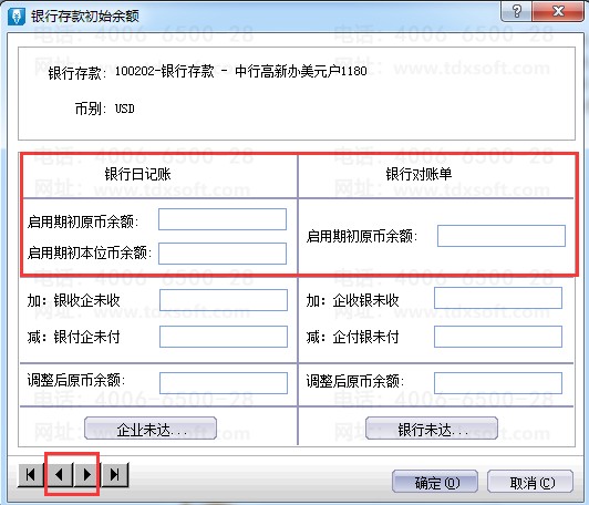 2、在[银行初始数据]窗口,单击左下角的左右图标,则可以在各明细科目之间进行转换;
