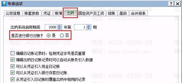 2、没有使用出纳管理模块,点击[系统维护]-[账套选项]-[出纳],将[是否进行银行对账]选择为[否];