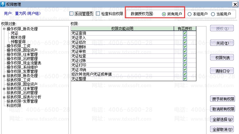 单击[系统维护]—[用户管理],选中B用户单击[授权],将数据授权范围选择为[所有用户]即可。