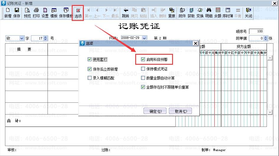 1、凭证录入页面点击[选项]-勾选[启用科目预警]参数;