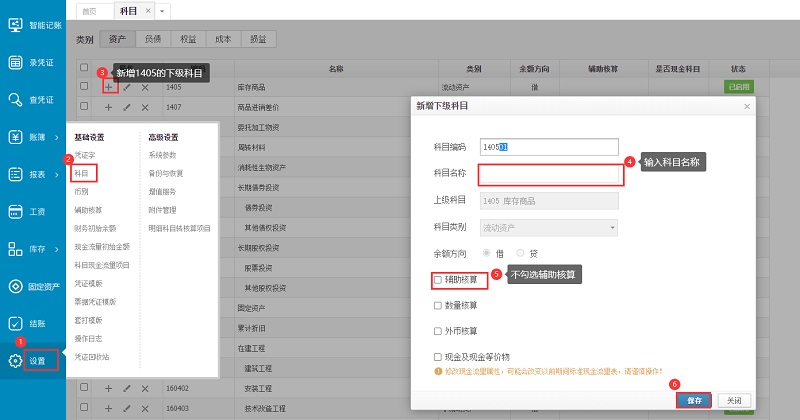 2、在【辅助核算】 -- 【存货】中添加存货明细