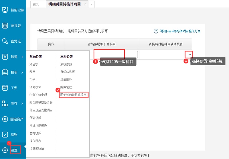 注:启用库存的前提是科目必须设置“存货”辅助核算,当前调整方式同样适用于其他科目!!