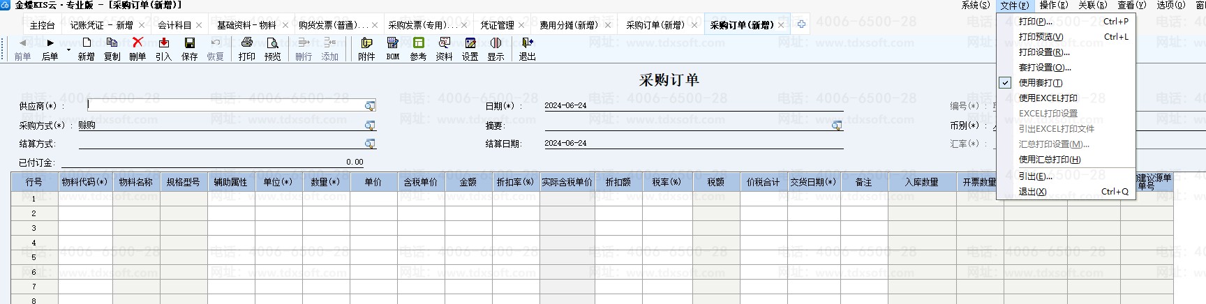金蝶专业版采购订单使用套打在哪里勾选