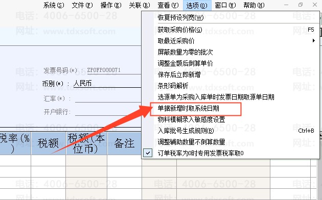 2.点击采购发票右上角的选项下面,取消单据新增时取系统日期的勾选即可。