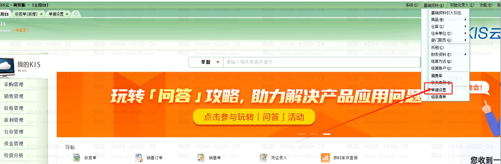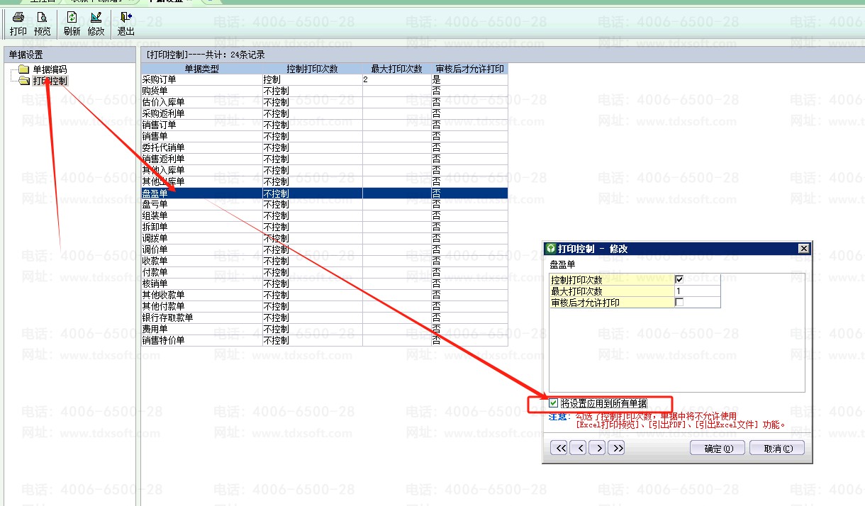 进入商贸版主界面后,依次点击进入【基础资料】-【单据设置】-【打印控制】-选择任意单据类型进入并设置最大打印次数后-勾选参数【将设置应用到所有单据】即可,
