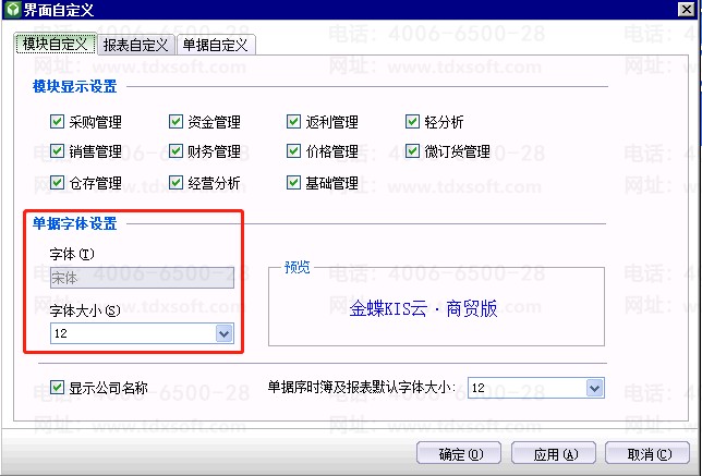 在主界面单击[系统]-[界面自定义]-[单据自定义],在[字体设置]中选择字体大小即可。