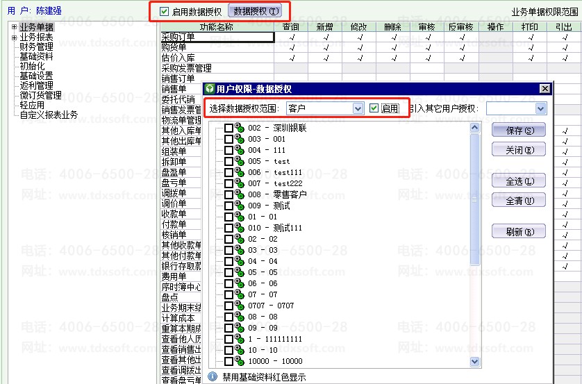 单击[用户管理]-[授权]-[数据授权]中勾选相应客户权限(新增的客户资料默认未进行勾选)。