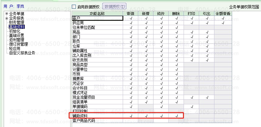 进入[基础管理]模块,单击[用户管理],选中该用户单击[授权],选择[基础资料],授予对应的[辅助资料]权限。