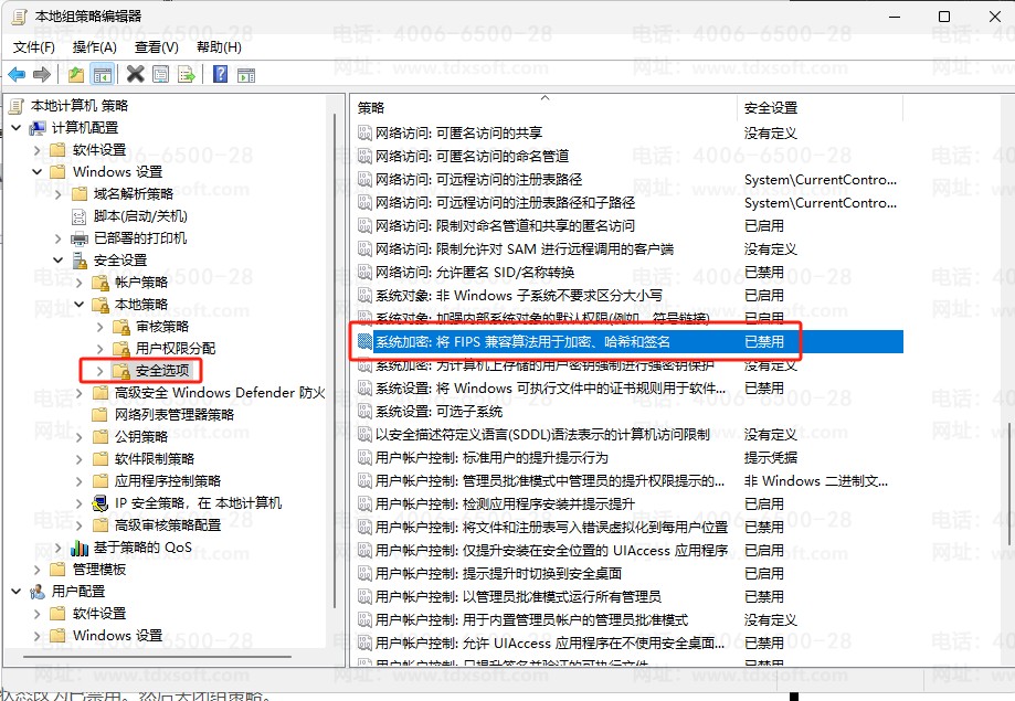 2、左侧列表中找到 计算机配置 - Windows设置 - 安全设置 - 本地策略 - 安全选项,并在右侧找到“系统加密:将FIPS兼容算法用于加密、哈希和签名”。